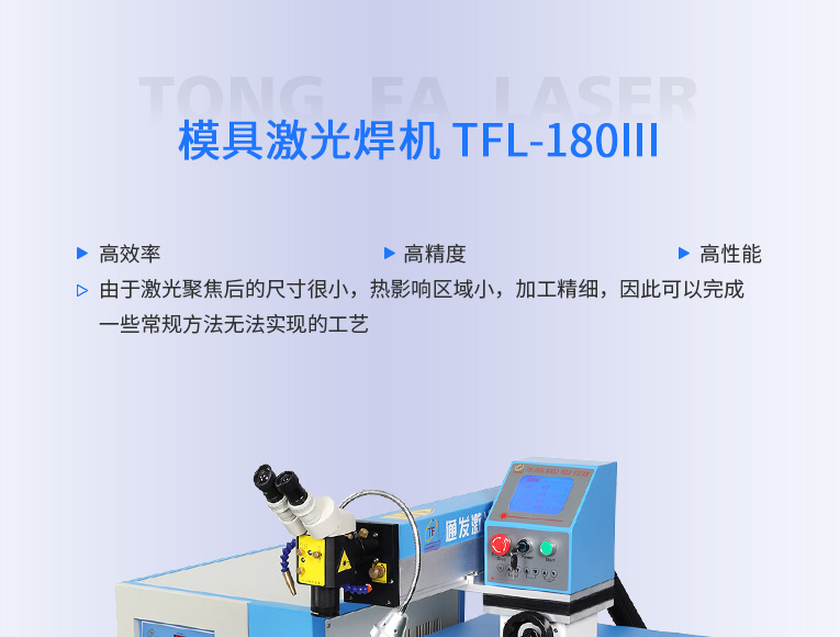 普通型模具激光焊機(jī)TFL-180Ⅲ是通發(fā)激光公司的模具激光焊機(jī)中銷量較大的傳統(tǒng)型,配置激光頭手搖升降與工作臺(tái)按鈕電動(dòng)升降實(shí)現(xiàn)焊接不同厚度模具的激光焊加工。本系列機(jī)型適用于各類精密注塑模具激光補(bǔ)焊、壓鑄模具激光修補(bǔ)焊接;同時(shí)也適合鑄件沙孔激光修補(bǔ)、模具磨損激光修復(fù)、過切加工等的激光修補(bǔ);各類金屬結(jié)構(gòu)件激光焊接加工、金銀首飾激光焊接加工。
